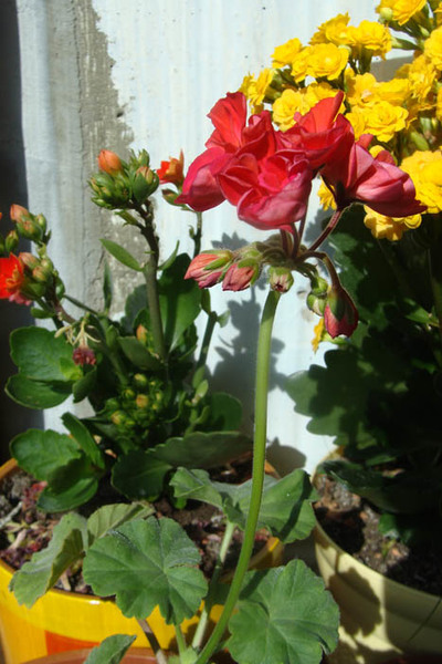распустилась герань красная - очень красивые цветы у неё! сорвала на улице))))) позади жёлтый всё та же каланхоя, цветёт уже месяц а может больше, красная каланхоя по новой пускает бутоны - на покой не думает идти)