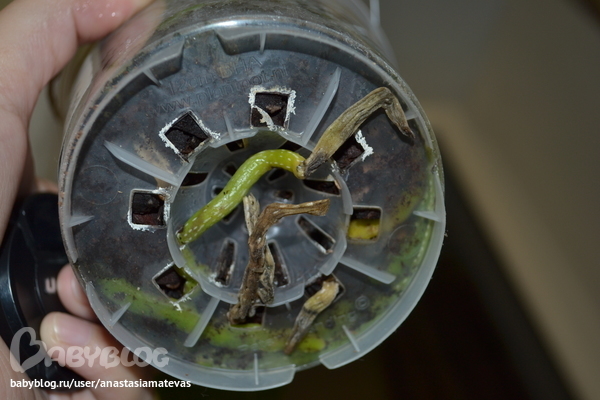 Только я по периметру стенок еще дырочек наделала и все дно продырявила))) горшок берете на 1 см больше имеющегося, аккуратно вытряхиваете орху из горшка, промываете корни, отделяете их аккуратно от коры, обрезаете сухие и гнилые корешки до здоровой части, срезы присыпаете корицей ии толченым углем, можно прижечь зеленкой. Подсушиваете корни, в это время готовите кору (я выше написала как), затем на дно кладете дренаж слоем см 2-3, устанавливаете посередине горшка орху, держатель цветоноса и начинаете засыпать корешки корой, смотрите сильно ее не заглубляйте, после пересадки не поливайте ее пока корни не станут серебристо белыми (когда корни зеленые поливать не надо, т.к влаги в горшке предостаточно и надо ждать полной просушки). поливать надо погружением горшка в таз с водой минут на 10, поливают 1 раз в 7-14 дней-зависит от просыхания коры (как только корни перестанут быть зелеными и приобретут серебристо-белый цвет, на стенках горшка не будет конденсата, тогда кора просохла и можно поливать) Орху лучше недолить чем перелить