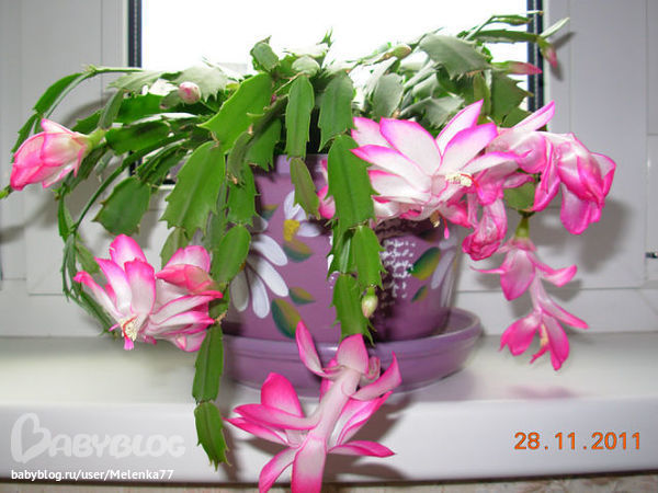 Это не шлюмбергера (на фото) это рипсалидопсис, их часто путают, но цветы у них, впрочем как и листья совсем различны. Его еще называют Пасхальным кактусом. Так как цветет он в основном весной, в начале или в середине. Вообще у меня в коллекции 10 сортовых лесных кактусов, из низ 4 рипсалидопсиса и 6 или даже 7 (уже не помню) шлюмбергер. Шлюмбы цветут зимой как правило, но сейчас у меня хотят зацвести 2