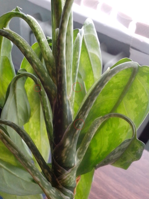 SOS! Помогите цветику!Есть на работе парочка аглаонем и все они покрыты капельками прозрачными и липкими, как будто сахрный сироп. Листья у цветочков желтеют. Вид не презентабельный. Коллега на работе обрабатывает все цветы какими-то средствами химическими от паутинного клеща. Но эти капелькт так и остаются. Что с ними делать?