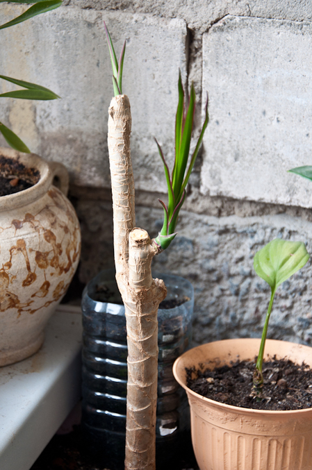 новая жизнь драцены. когдато она была уже большой но начала пропадать. вот - спасаю. как у неё ещё ноги не выросли чтоб от меня убежать... рядом на ней спацик, который год торчит в одном положении и не вянет и не растёт.