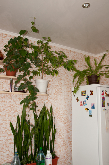 а это домашние жители - циссус, которому неплохо почти в тени, фикус бенжамина - верхушка от того, что был вначале, нефролепсис)