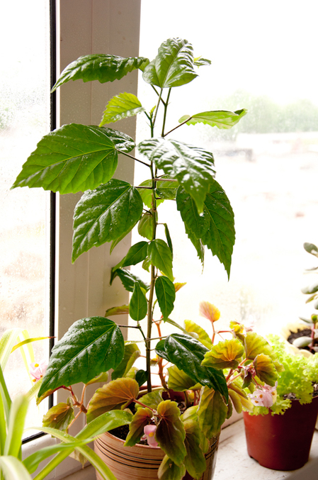 гибискус. ему полтора года. был откусан от большого дерева в феврале 12го, ещё не цвёл и наверное не хочет. в нём торчит и цветёт бегония. сзади салат - попугаям трескать)))