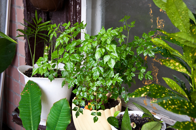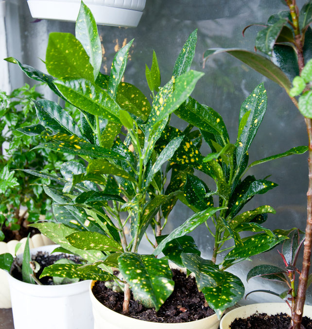 кротон, который многое пережил. сначала он был цельным деревом, пока я не отчикала верхушки, он болел. счас это 3 самостоятельных дерева.