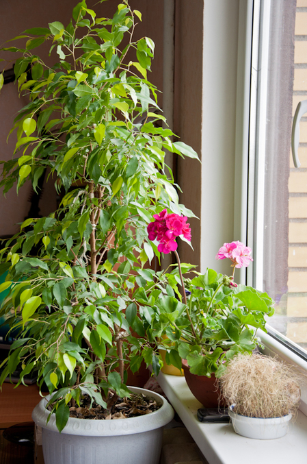 старенький бенжаминчик с обрезанной верхушкой, ростёт без лучей солнца в северной комнате, потому такой салатовый, не считая новой листвы))) и новая бегоша рядом