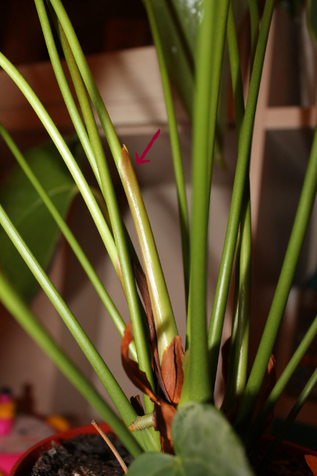 Эти обнимашки из-за того что сначала вылазит небольшая стрелка и потом раскрывшись начинает оттуда расти лист и этот типа кокон остается обнимать лист))) потом из этого кокона вылезит либо еще один лист, либо цветонос))) цветонос вылазит сразу с красным на конце стрелки