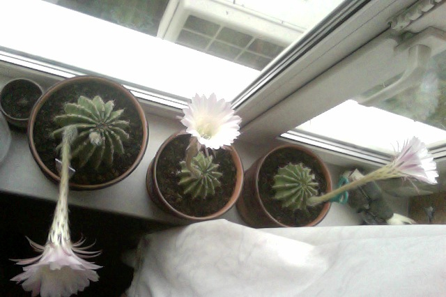 ни фига. этим кактусам(большому) лет 10-12.. и каждый год они цвели, пока он в беляево не съехал.. а потом 2 года не цвели... он вернулся — уже второй раз цветут.. он их любит очень.. а они его)