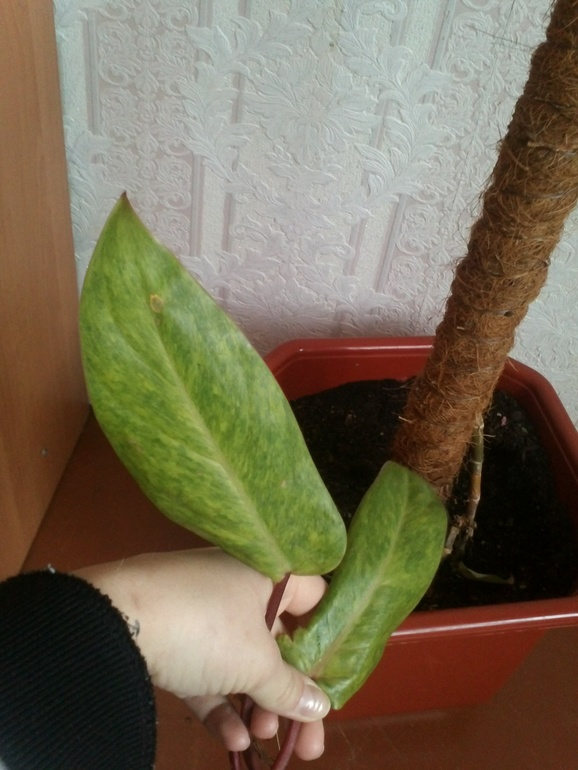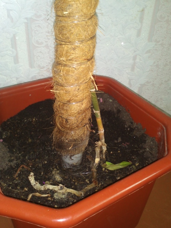 SOS! Помогите цветику!Мне отдали растение в большом горшке,в горшке вставлена декорированая палка по которой рос цветок на цветке было 2 листика.В итоге вверху палочка с листиками по середине сгнила и поломалась.Короче остался цветок без листиков вообще.Что ему делать,как ухаживать и главный вопрос как он называется???