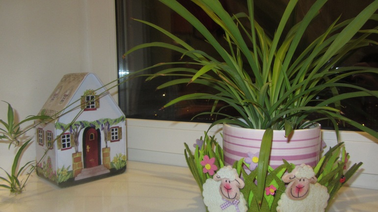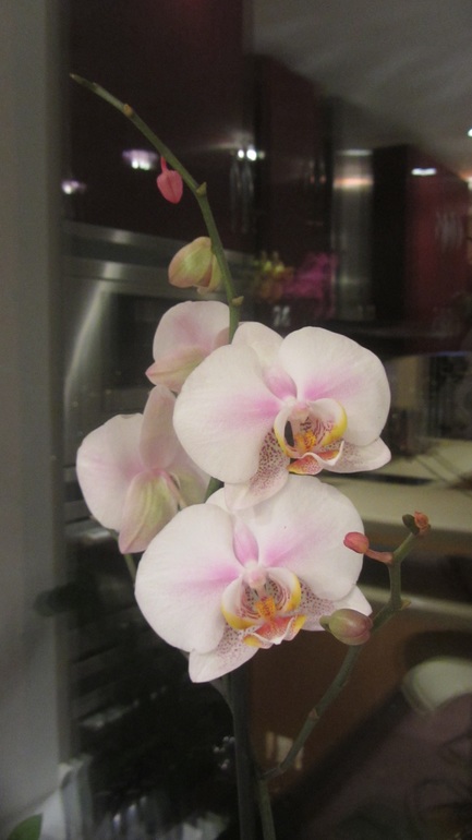 Орхидеи это те что не прижились к сожалению. Но идея с зеркалом мне понравилась. Такое ощущение что их в два раза больше. И по цвету с кухней красиво получилось. Низ у кухни желтый.