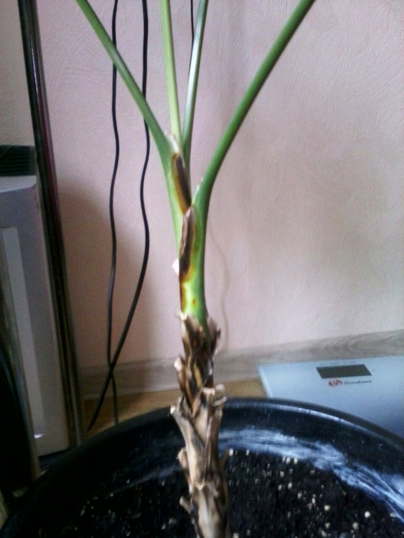Тут дело для меня запутано очень сильно. Вместо моего милого пышного кустика ко мне вернулась длинная палка и 3 ( теперь 4) веточки на верхушке. На стволе коричневые пятна. Фото: