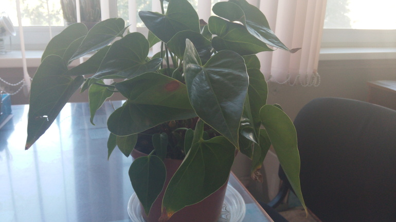 Скорее всего его ни чем не удобряли ( перешла на новое рабочее место он был уже). Солнце утром ярко светит до обеда, стоит на столе возле окна. В какой грунт его посадить? Если куплю для антуриуму? Чем удобрить лучше.