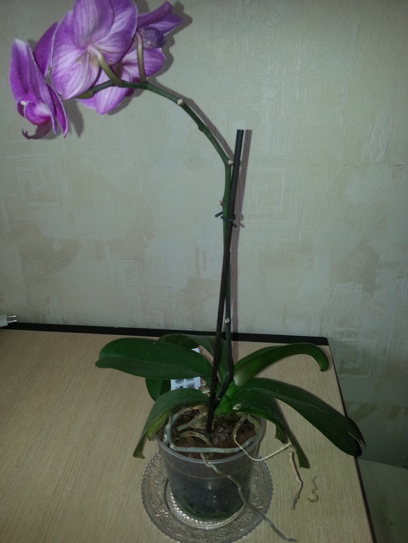 ОрхидеиДевочки, подарил мне муж орхидею. Раньше с ними дела не имела. Сейчас она отцветает, и что дальше? Посмотрите пожалуйста по фото, надо ли ее пересадить? И нормально ли, что корни на поверхности высохли?
