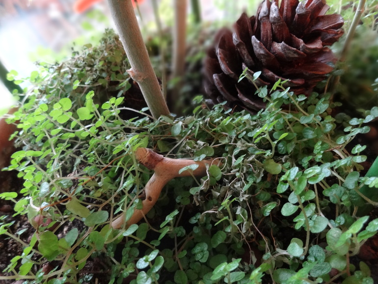 Как вы относитесь к большим цветам, когда на первом ярусе (в горшке) просто земля? Я обычно засыпаю ее сосновой корой - и земля не пересыхает, и выглядит красиво. Вот здесь посадила к абутилонам почвопокровную солейлорию, очень красиво получилось: