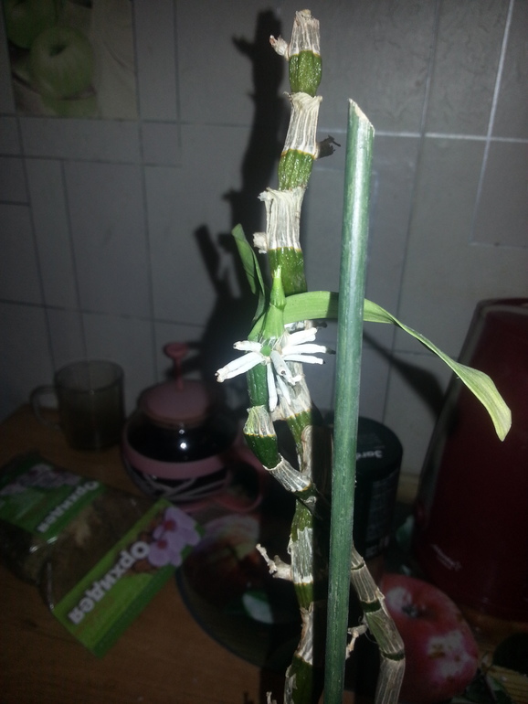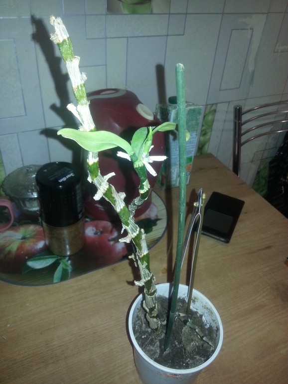 Закрепите дендр над пустым горшком, и не поливайте минимум до апреля. Может еще наростит корешки