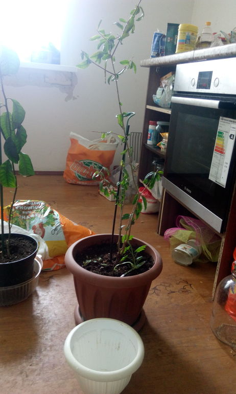 На первом фото гранат, новые ростки больше не дает и только отбрасывает листья...Жалко его... Не пересаживали наверное года два. Вот думаю посадить его в меньший горшок.