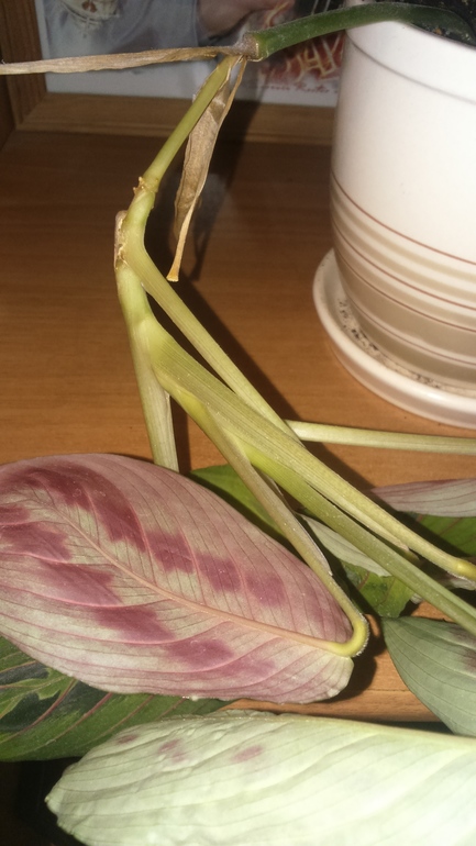 SOS! Помогите цветику!девочки помогите понять, что с цветком. К сожалению нет у меня фото, когда маранта была в шикарном состоянии, в данный момент выглядит она так, много крупных старых листьев засохли, те которые на фото смотрят вниз это молодые, но почему они такие.... В общем вот фото