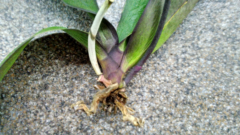 2) Муж на 14-е февраля купил фаленопсис (конечно же), но покупал вечером. Выбирал лучшее из худших. Принес и я полунаметанным:) глазом определила, что корней живых там нет. Имея опыт наращивания корней у "Абалденно-красивых-неАбычных" синих (читай: крашенных) фаленопсисов