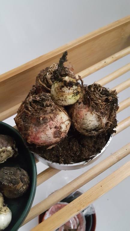Другие растенияДевочки, кому удалось луковицы нарцисов, гиацинтов и иже с ними сохранить после цветения на подокойнике до следующей весны? В этом году впервые купила нарцисы и гиацинты в горшках, когда отцвели обнаружила в инете их рекомендуют после цветения либо выкинуть либо высадить в открытый грунт. Я решила их таки сохранить. Попыталась сымитировать естественные условия: дождалась когда листья сами завянут и отпадут и оставила луковицы в горшках. Гиацинты я совсем закопала в горшок, нарцисы итак были закопаны. Поставила их в шкаф,;периодически увлажняла почву, но без энтузиазма. Осенью их раскопала и вот что у меня в итоге получилось (см. Фото). Все луковицы твердые, без повреждений. Маленькая луковичка гиацинта дозрела (была зеленая и бесформенная). Нарцисы без корешков, гиацинты уже пустили корешки и маленькие зеленые ростки, что мне, если честно не по душе... хочу добиться их цветения весной... В общем, я их высадила на посадку, накрыла платиковым пакетом и отнесла в гараж. Пока не поливала... Земля немного влажная. В общем, жду результатов. Интересен ваш опыт в повторном выращивании луковиц в горшочках на подокойнике )