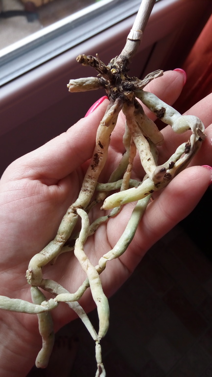 Не обнадеживайте! Возможно, кто-то что-то там спасает, но там бывает живой ствол хотя бы с одной живой спящей почкой, которая дает новую розетку. Здесь же живого ничего нет, кроме остатков корней, ствол иссох и давно мертв... Мне жаль, но, кажется, Ваша орха погибла и давно. Не расстраивайтесь!