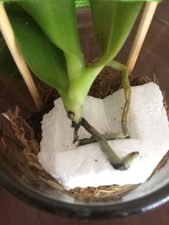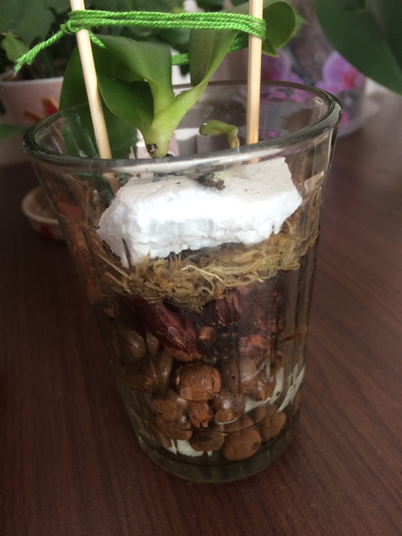 Достала свою, корешка уже два осталось в живом состоянии. Сделала все как в видео. Стакан - на дно керамзит, потом кора, сфагнум и кусок пенопласта. На него поставила то, что осталось от орхи.