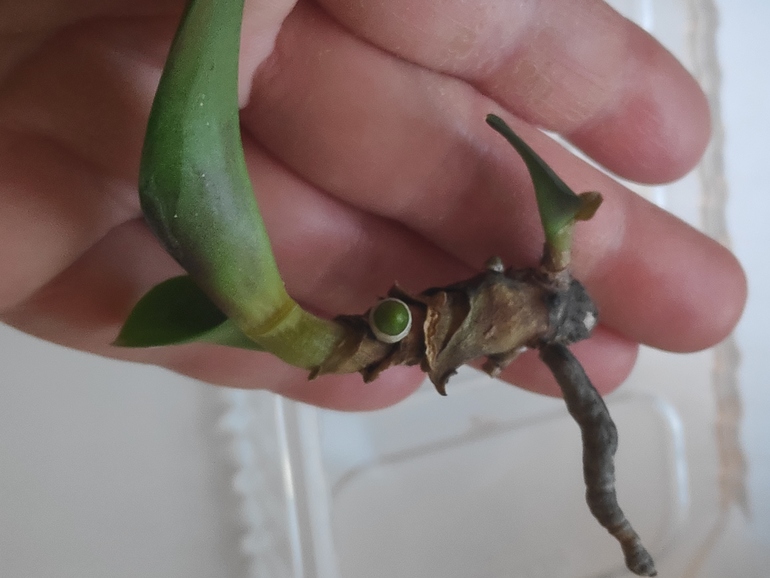 Предисловие. Куплена орха по уценке, по приезду домой начала медленно загибаться. Была осмотрена, пересажена, без видимых "какашек" продолжила терять тугор и листья. Потом даже выплюнула цветонос с двумя цветочками, видимо напоследок пыталась сказать "алаверды". Была пересажена еще раз, обрезала сомнительные корни, решила что может подмерзла, может подзалили (пока я отъезжала). Но она продолжила свою грустную историю. В общем почти загнулась и я в очередной раз полезла ее перетряхивать, обнаружила отгнившие корни, на оставшемся одном (их и так не густо было), сосущие насекомые в виде мучнистого червеца и предположительно черную гниль на шейке. Ок. Хотя бы ясно почему орха дохнет. Обрезаю все сомнительное, остается...хм...впрочем, почти ничего не остается. Кусочек шейки с тремя тряпошными листьями. Засыпаю все золой, сушу и вешаю "останки" над водой. Листья продолжают отсушиваться и скукоживаться. Переворачиваю орху вверх "ногой", опускаю листья в воду. В итоге, листья один за другим отваливаются, но от "кочерыжки" лезут новые листочки и (о да!) жирненький корешок! Теперь вопрос. Что мне с орхой делать?