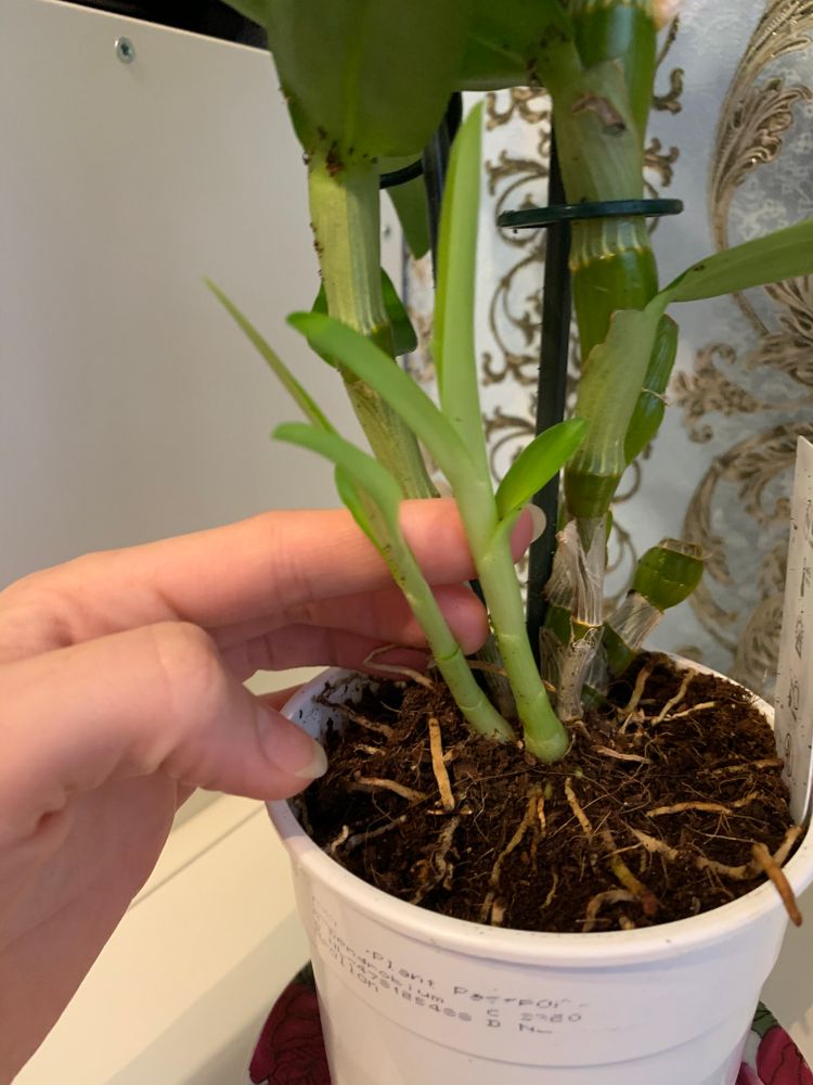 Сажать в кору или пока так оставить можно. Им для цветения нужна прохладная зимовка. Полив так же зимой сокрашают. Это дендробиум у вас. Новые росты вызреют и могут процвести.