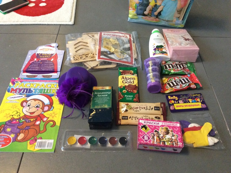 Вот наши чудесные подарки. Все Варины мечталочки: краски и расскраски, заколочки и поделочка -кормушка для птиц; молочный шоколад и сладости для папы и много много няшностей!!!