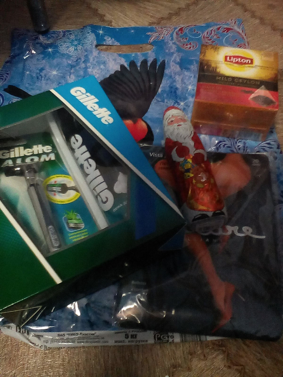 В подарок войдет:чай,шоколадный дед мороз,надор для бритья и для прекрасной половины-колготки черного цвета 3 размера.