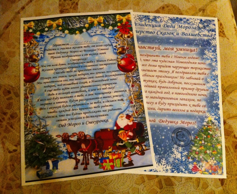 Огромное Спасибо!Сегодня я получила интересное письмо. Внутри два послания от Деда Мороза: одно мне, второе-моей дочке. У дочки это первое в её жизни поздравление. Да чего греха таить, у меня тоже. Не присылал мне раньше Дед Мороз писем. )) Видимо в уходящем году я была хорошей девочкой.