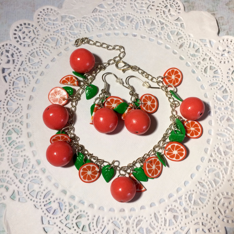 Летний комплект с апельсинами для мамочки (браслет и серьги). Материалы: полимерная глина, металлическая фурнитура (бижутерный сплав на основе олова), размеры свободные, все регулируется. Ручная работа