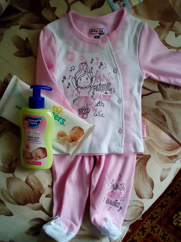 В розыгрыше вот такой костюмчик (рост 62см), крем-гель для купания и влажные салфетки. Могут участвовать также мамочки ожидающие девочек)).