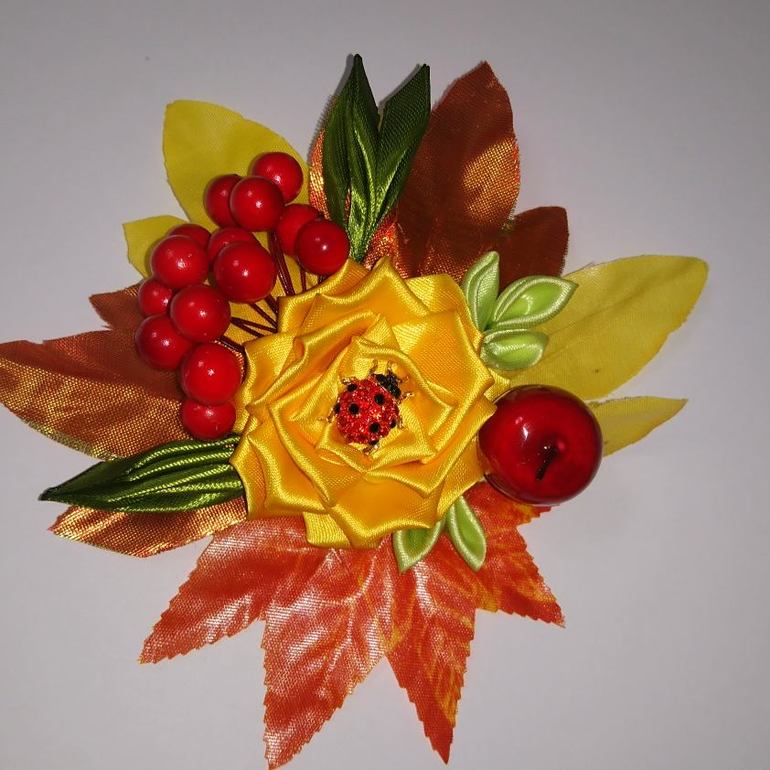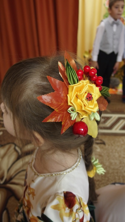 Конечно,за один день и с тремя детьми,я ничего не успевала.Пришлось делать ночью заколку самой.Я очень жалела,что не купила заранее.Были у меня листочки из фикспрайса и божья коровка.Но,плюсы есть.Я приблизилась к рукоделию,искала много литературы про