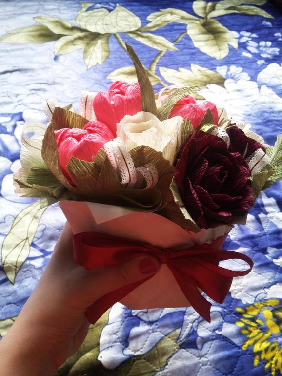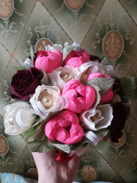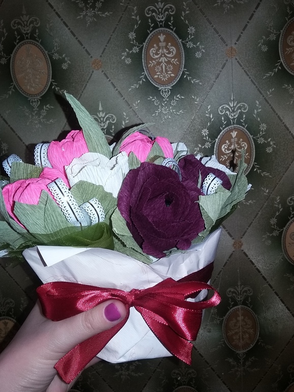 Спасибо огромное за Ваш труд! Букет очень красивый! С конфетками внутри каждого цветка! Чудесный подарок! Пока в ожидании мамы (это для нее подарок)сфоткала красоту❤❤❤