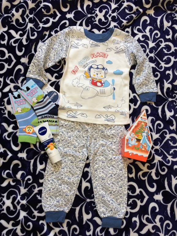 У меня только детское, предлагаю милую нежную пижамку на мальчика (или кому как) из хлопка на рост 80-86. На бирке указано 86-92, но она немного маломерит, если малыш крупный то 74-80 соответственно. 2 пары носок на этот же возраст от 10 месяцев, шоколадный набор Киндер (срок годности до 05.07.18) и для мамы крем для рук.