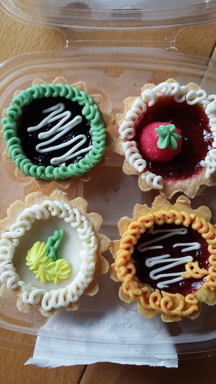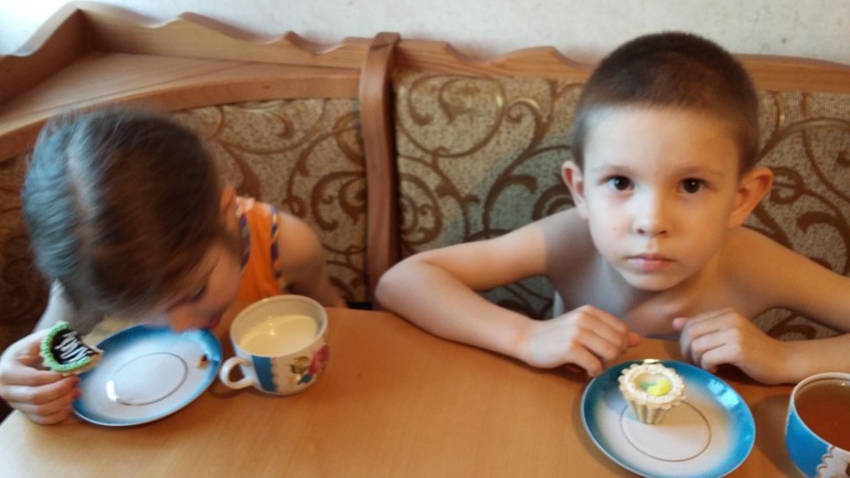 Мы себя побаловали пироженными, пока нам мороженное нельзя :(. И сами вкусняшки и наши довольные мордашки.