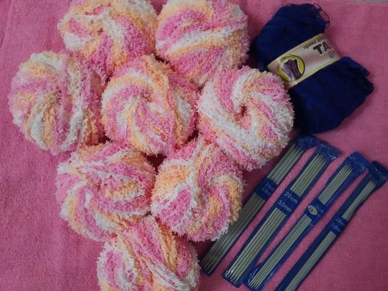 8 моточков секционной пряжи Беби мохра 50г/ 85м (новая, но без этикеток,перевозила через границу), моточек пряжи для шарфа, 4 набора носочных спиц.