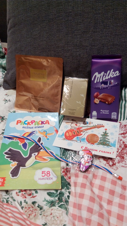 Кроме основного приза в посылке была куча приятных и неожиданных сюрпризов - маска для лица, шоколадка, гибкий карандаш, магнитик, раскраска с наклейками и симпатичная открыточка с новогодними поздравлениями)) Карандашик тут же забрала себе старшая, магнитик - средняя, а шоколадку - муж)))) все остальное я припрятала у себя)) Большое спасибо, Галина! С наступающим новым годом!!!