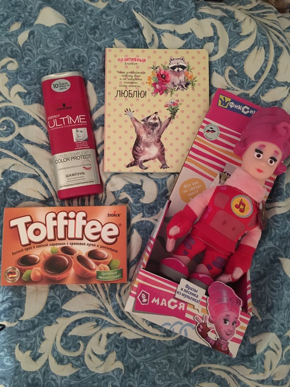 Подарком будет Мася из Фиксиков, шампунь и блокнот для мамы и сладкое.