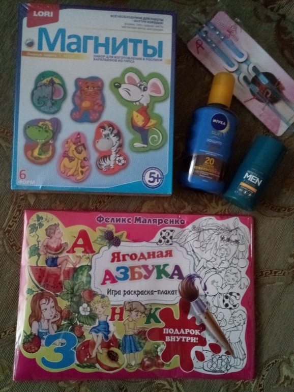 Набор для изготовлентя магнитов, Ягодная азбука (игра раскраска- плакат), Солнцезащитное масло для загара Nivea Sun "Защита и загар" ,Палочки для волос,Шариковый дезодорант North For Men Recharge .