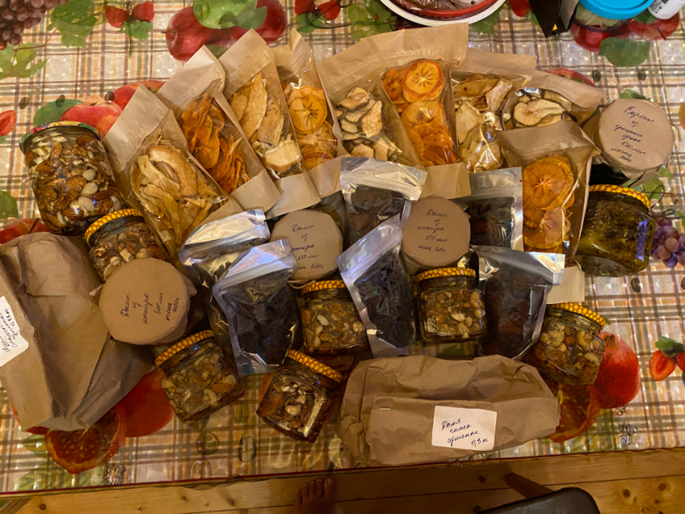 Слайсы из хурмы и дыни божественны! Забрус понемножку жуем всей семьей. Варенье из грецких зеленых орехов ждет своего часа для выходного чаепития.