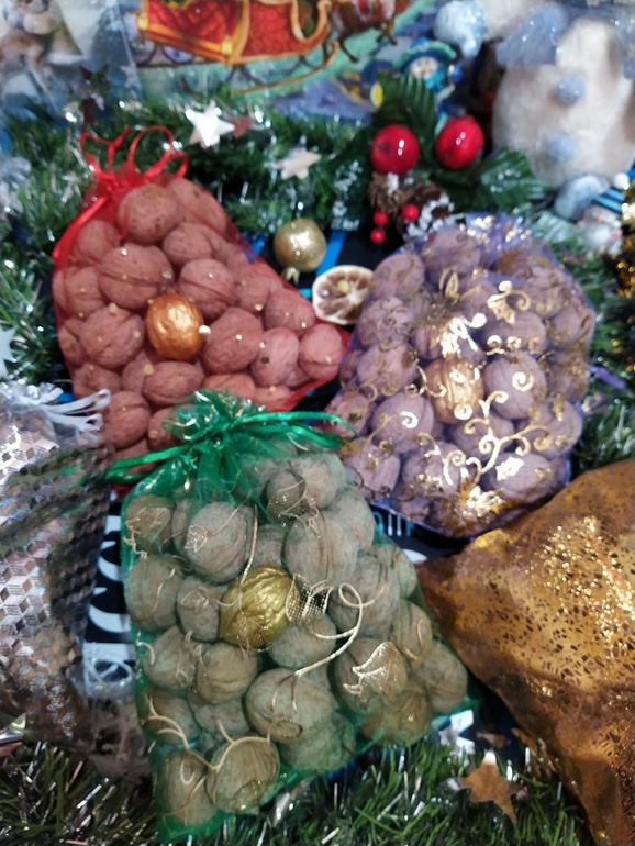Теперь к Новому году надо было что-то придумывать. И тут мой источник вдохновения Оля Пчёлка. https://www.babyblog.ru/user/lenta/mama161 Даже ссылку можно не вставлять, эту волшебницу все знают. Я подсмотрела у неё отличный вариант подарка: мешочек грецких орешков с одним золочёным орехом с предсказанием.