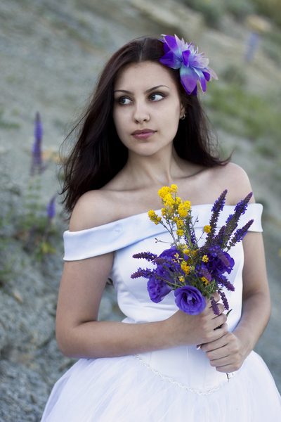 Едва уловимая диагональ, образуемая плечами девушки и вторая (руки и букет) дает понять, что девушка сейчас двинется с места, она не статична, но движения ее легки и плавны. Еще одна линия в кадре - это горизонтальная линия взгляда. Она показывает твердость решения и отсутствие колебаний в мыслях героини.