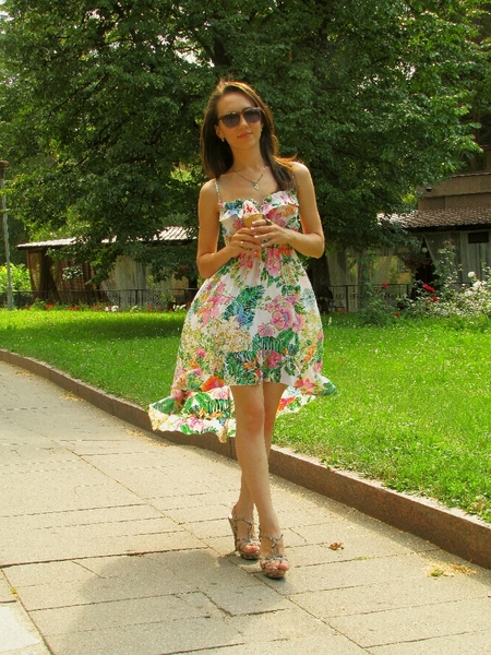 однозначно вторая... первая банально по стойке смирно к тому же с жуткими пересветами! вторая нежнее смотрится платье красиво развивается.. даже шарм какой то это придает снимку...лучше если бы смотрела она не в камеру и не в очках...очки смотрятся как то пафосно и ни как не гармонируют ни с платьем ни с образом ни с задним планом...
