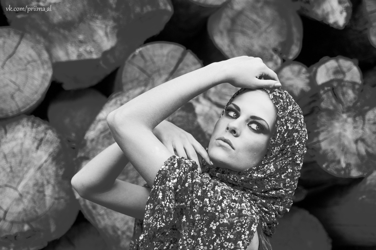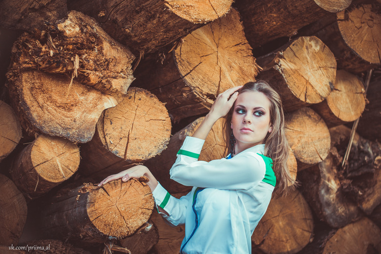 Мне кажется, одежда и фон не подходят друг другу. С таким платьем на заднем фоне мне видится кирпичная стена, камень, стекло, городской пейзаж. А бревна колоритные! К ним бы платье, открывающее плечи. Последняя с платком гармоничнее всего.