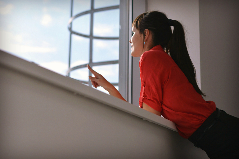 а на 6 очень забавно сыграла ручка окна)) девушка еще сама в красном, а эта ручка словно пробивающиеся рожки)) а угол сверху (от окна) воспринимается как коробка, в которой она себя сдерживает, ну или ее сдерживают))