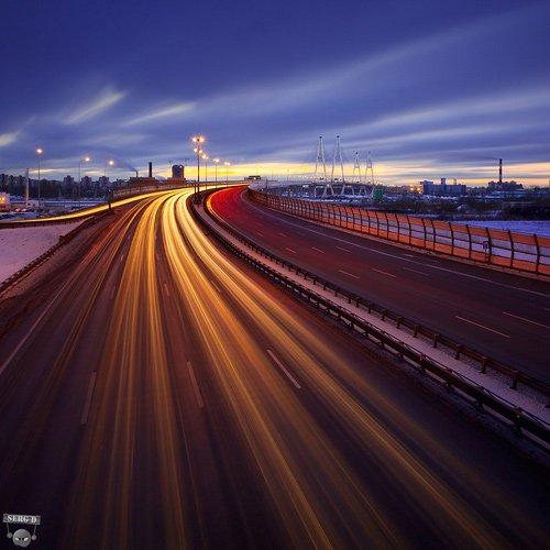Качественная съёмка в тёмное время суток обязывает нас увеличить выдержку, а потому проезжающие мимо автомобили в подавляющем большинстве случаев оставят от себя лишь размытые яркие полосы - следы от фар. Если вы хотите использовать эти следы в качестве художественного элемента, снимая скажем достаточно плотный поток автомобилей, советую обратить внимание на сверхдлинные выдержки.
