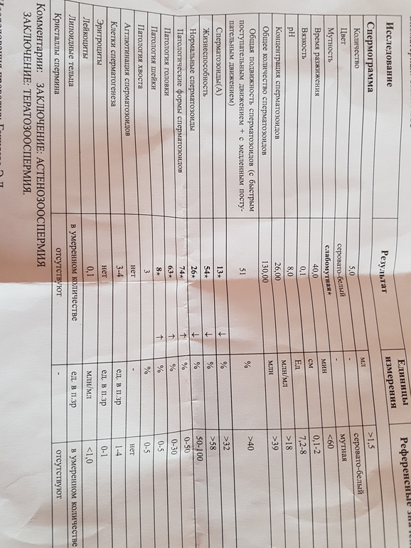 Ой, напугали вас, млин, заключением...1) С количеством у вас все вообще шоколадно! 2) Подвижность - тоже в рамках нормы вполне, даже выше нужного критерия. Да, самых шустрых не так много, но вполне достаточно!! Зато не самых шустрых, но дееспособных ( которые спрячутся и будут выжидать выход яйцеклетки) у вас вполне достаточно!! 3) По морфологии мне сложно судить, т.к. анализ делали явно не по крюгеровской морфологии, НО!! морфология у вас не на нуле ( а даже если б на нуле была, шанс поднять ее также есть). Сходите к хорошему андрологу ( надеюсь, вы идете не к бесплатному), и попьете месяца три бады-витамины, все улучшится..Плюс надо смотреть, не варикоцеле ли это..И посоветую тестостерон еще сдать. В любом случае, у вас ну вот далеко не плачевный результат, очень даже приемлемый, так что не пугайтесь, честно!!=))