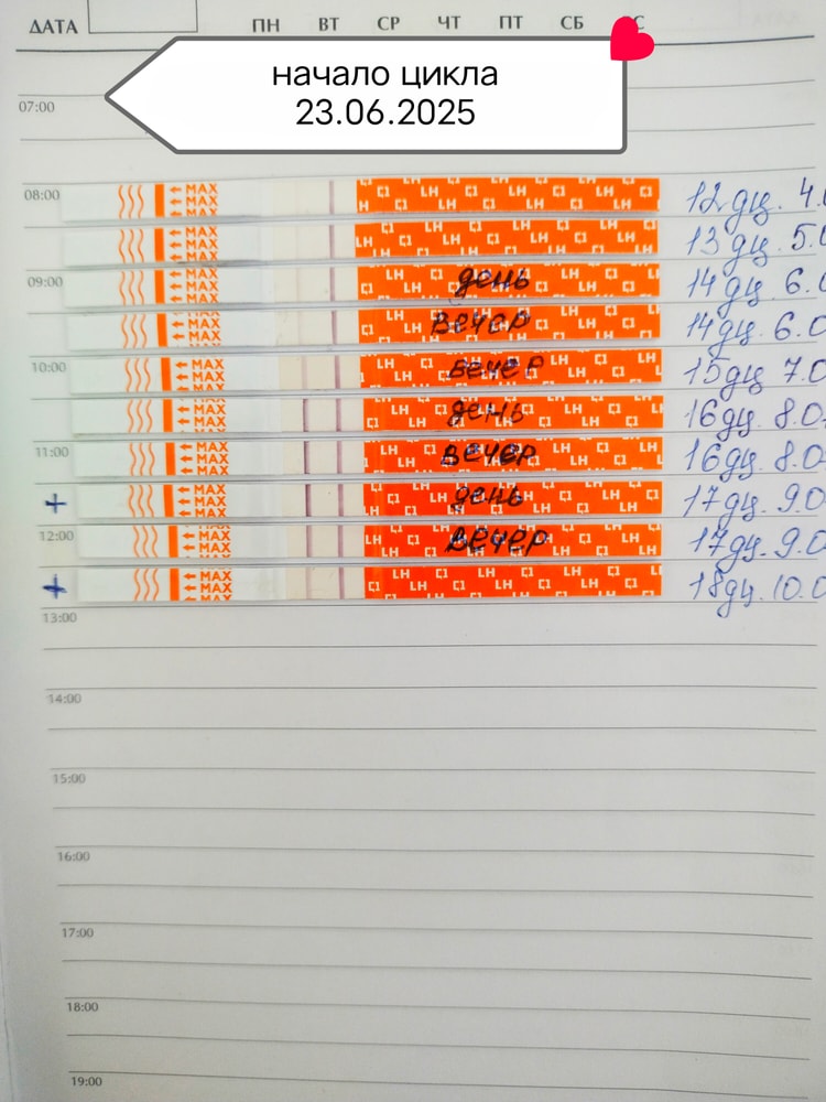 Прошлый цикл был ановуляторный, продолжался 44 дня.Первый раз в жизни такой скачок, и именно когда я запаслась тестами и отслеживала с 8 по 20 ДЦ, но так и не дождалась (тут спрашивала, прошлый пост). На УЗИ поставили мультифоликулярные яичники. Выписали Дюфастон на 10 дней. Сдавала ТТГ повторно, результат 1.01 - норма. После пролактин, результат 635 - отклонение, максимальная граница 557. По результатам пролактина врач хотела назначить таблетки, но хорошо что дополнительно я сходила на прием к эндокринологу, который назначил мне повторную сдачу. И что вы думаете??? Приходит результат - 90. Я естественно с этим результатом пошла к гинекологу, таблетки мне уже не надо 😁 ну и отлично думаю) единственное что назначила, это витамины "Элевит зачатие" - инозитол и фолька в составе, в принципе норм) На Дюфастоне на 7 день начало мазать, прекратила пить, и через два дня пришли КД. Ну хорошо думаю, начало нового цикла наконец, опять запаслась тестами и ждала. На 10 дц пошла на УЗИ посмотреть есть ли ДФ, результат 11,6 максимальный в ПЯ, и похоже в этом месяце тоже не чего. Я надежды не теряю, начала делать тесты с 12 ДЦ, и на 16 ДЦ яркая полосочка, радости не было предела. Муж как назло на сутках, в этот день не виделись. Делаю тест вечером и надеюсь что О подождёт) и да, все норм, пик ЛГ продолжается. На 17 ДЦ утром очень яркая полоска, ярче чем вчера, и естественно утром к мужу, как приехал 😁 и в этот вечер болел низ живота, я наконец то её почувствовала, все предвестники, все совпало...на 18 ДЦ поехала на УЗИ удостоверится, что тесты не подвели. И да, О только была, не сформировалось ещё ЖТ, и нечёткие контуры...но только в ЛЯ, как так получилось непонятно, ну да ладно. Ну и на 18 ДЦ закрепили. Надеюсь на чудо) руки чешутся уже делать тесты 😁 тестоманка оказывается, но понимаю что рано. Ощущений не каких, но чувство что этот цикл победный, в этот раз бусинка закрепится, я верю ♥️