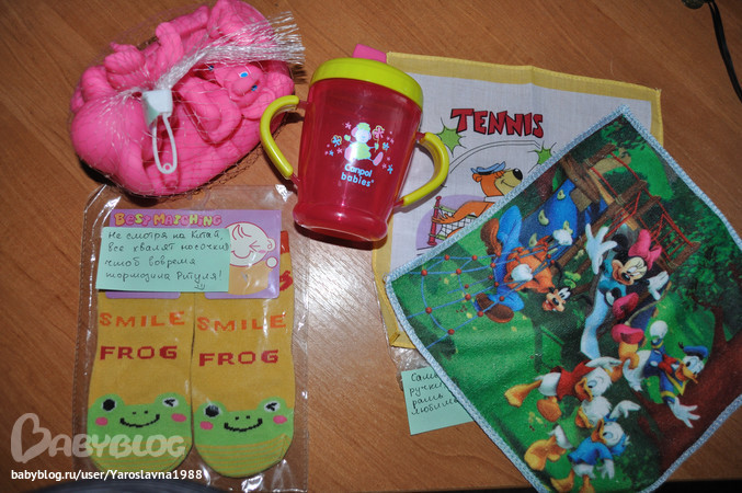 подарочки для дочурки ( поильник ( уурраа, давное его хотела), носовые платочки, носочки-лягушки, хи, и слонята для купания -такие милые)))):