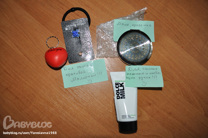 ну и конечно подарки для меня: зеркальце, резиночка для волос, кремик для рук( такооой ароматный) и брелочек к 14 февраля))